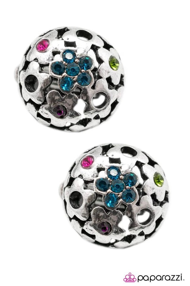 Dainty green and pink rhinestones dot the centers of an enchanting silver floral pattern. Shimmering blue rhinestones coalesce into charming daisy at the center of the design for a whimsical finish. Earring attaches to a standard clip-on fitting.
