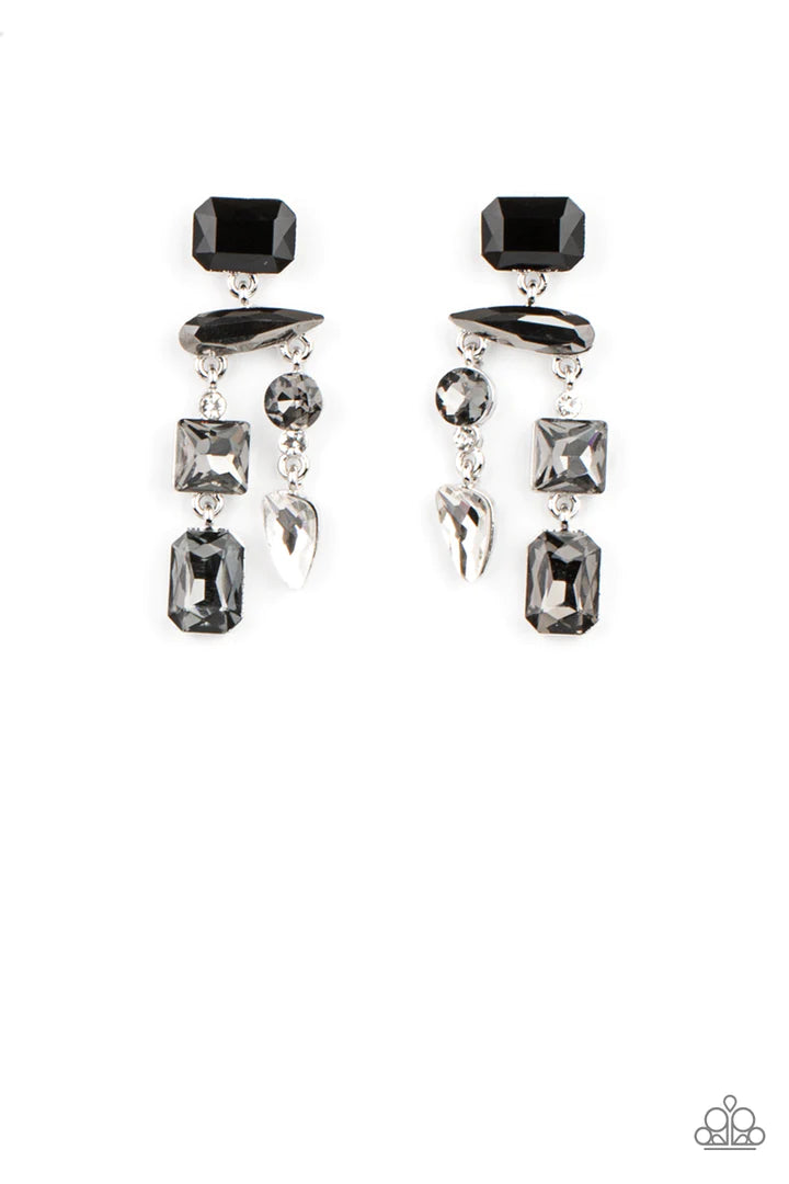 Varying in shape, a smoldering collection of black, smoky, and white gems haphazardly link into a edgy chandelier. Earring attaches to a standard post fitting.