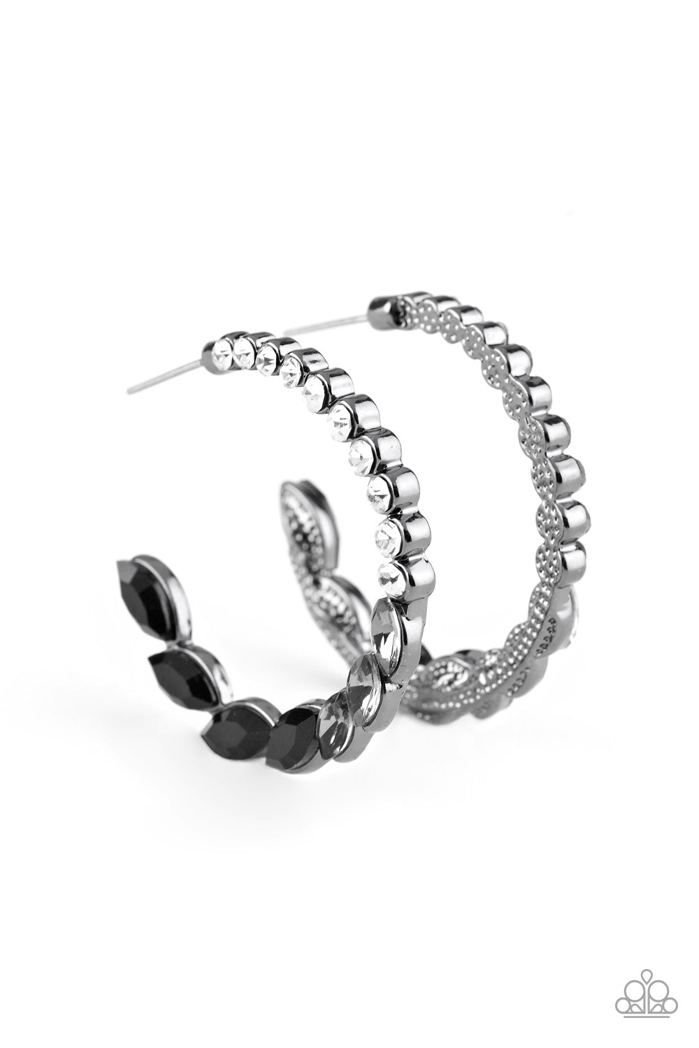 Gradually increasing in size, classic round rhinestones fade into smoky and black marquise cut rhinestones for a refined look. Earring attaches to a standard post fitting. Hoop measures 1" in diameter.