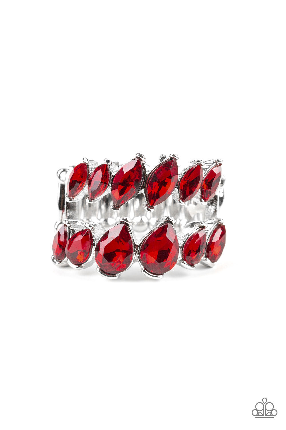 Increasing in size near the center, a row of red marquise style rhinestones stacks above a row of red teardrop rhinestones for a timelessly stacked look. Features a stretchy band for a flexible fit.