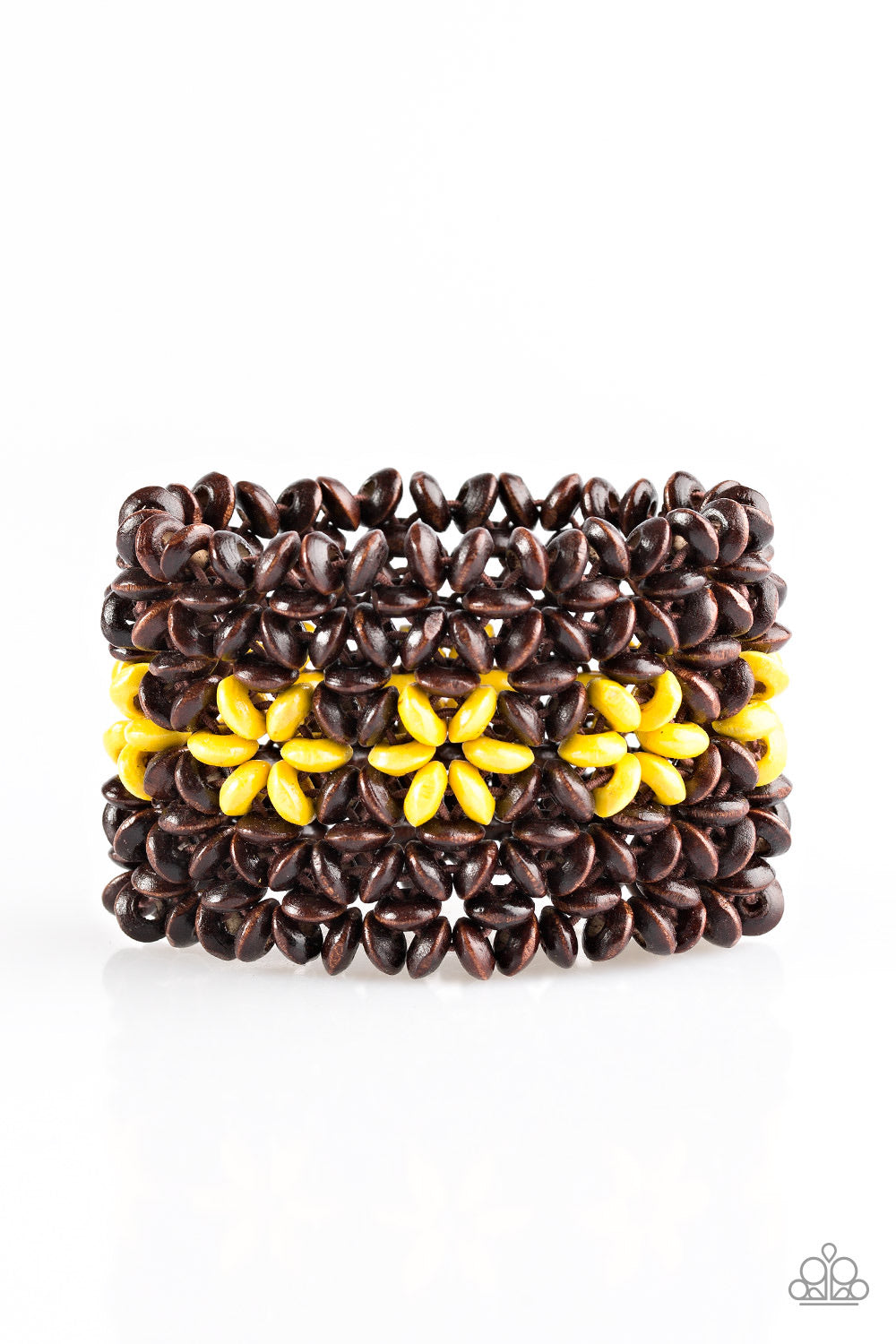 Earthy wooden accents are threaded along elastic stretchy bands, creating an ornate bracelet. Tinted in a vivacious finish, yellow wooden beads gather down the center, creating summery floral accents for a colorful finish.