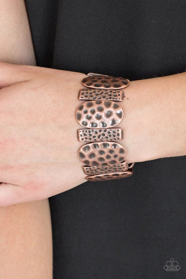 Delicately hammered in antiqued detail, round and rectangular shaped frames are threaded along stretchy bands, creating a bold tribal look around the wrist.