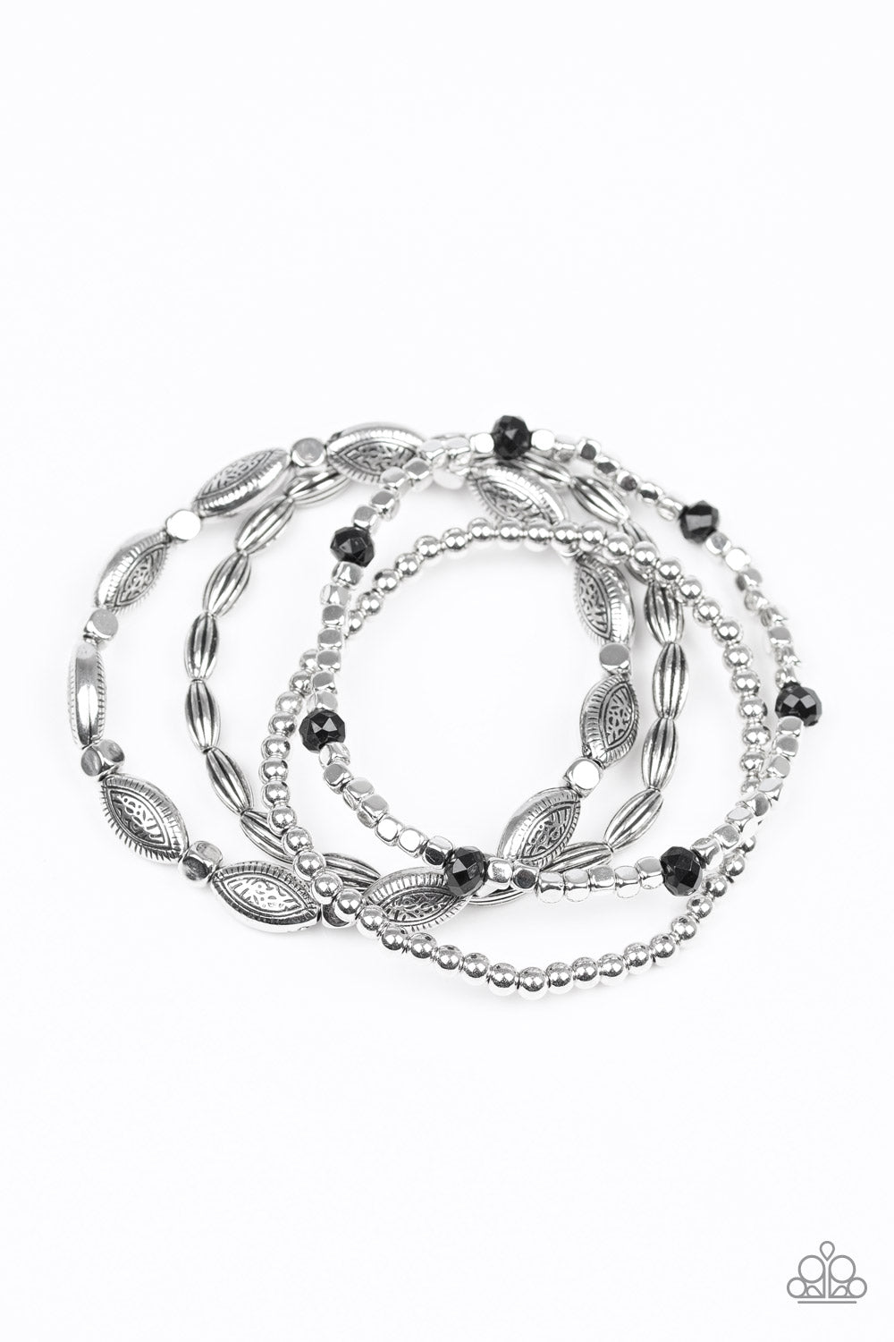 A collection of mismatched silver beads, silver cubes, and faceted black beads are threaded along four stretchy bands around the wrist for a colorful flair.