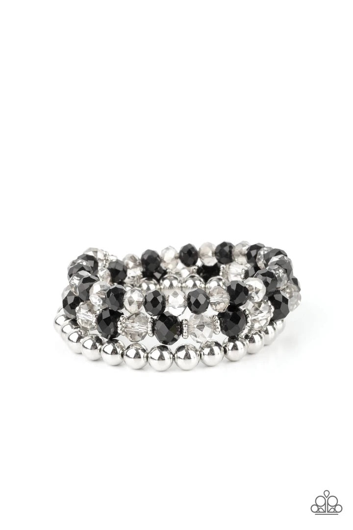 Sections of shiny silver beads and an alternating pattern of smoky and glittery black rhinestone gems gradually increase in size along a coiled wire, creating a jaw-dropping infinity wrap bracelet around the wrist.