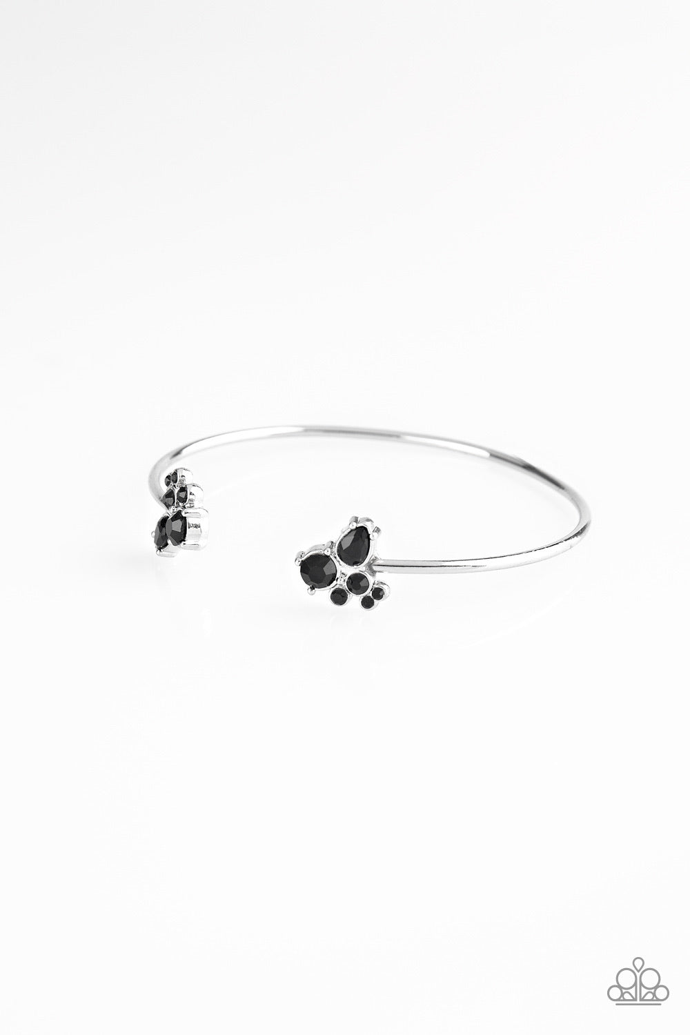 Varying in shape, glittery black rhinestones join at both ends of a dainty silver cuff, creating refined fittings.