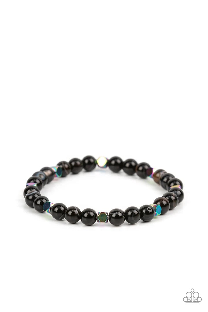 A dainty collection of natural-finished black stone beads and faceted metallic oil spill cube beads are threaded along a stretchy band around the wrist for an earthy flair.