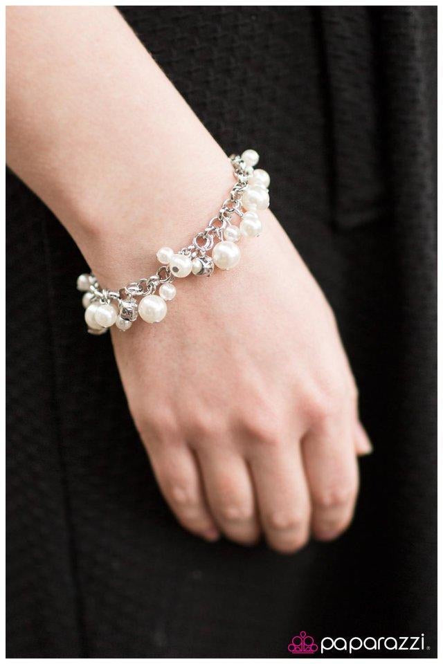 Classic white pearls dance around the wrist in an elegant display. Solitaire rhinestones drip between the pearls, adding a glitzy twist to the classic design. Features an adjustable clasp closure.
