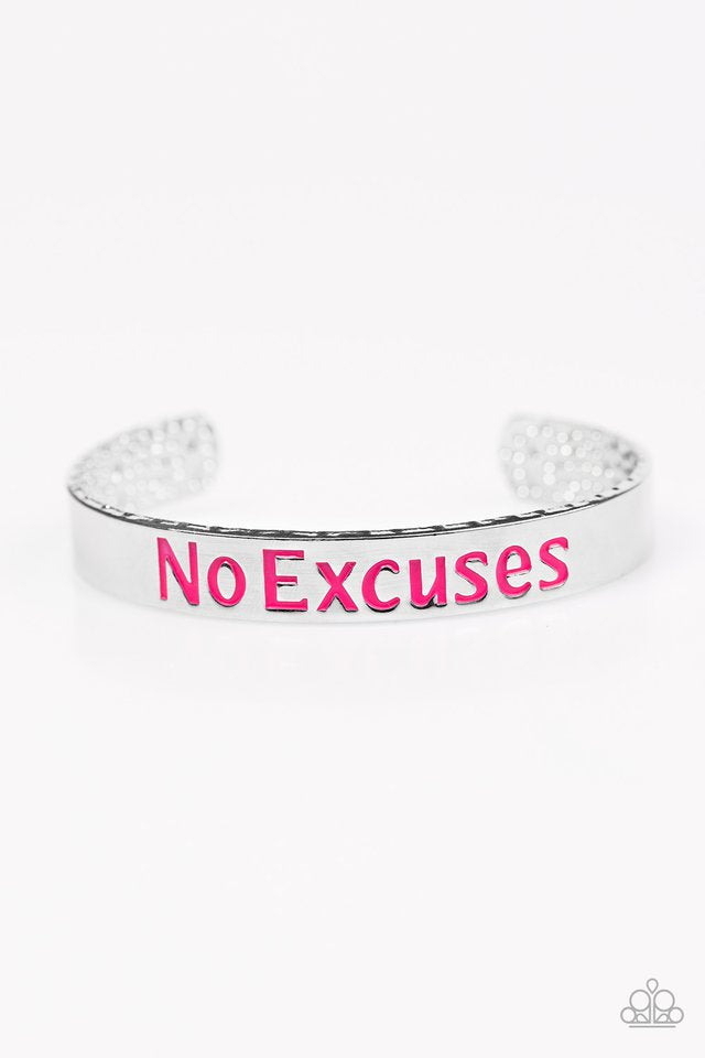 Tinted in a vibrant pink finish, the phrase “No Excuses” is stamped across a glistening silver cuff for a motivational finish.