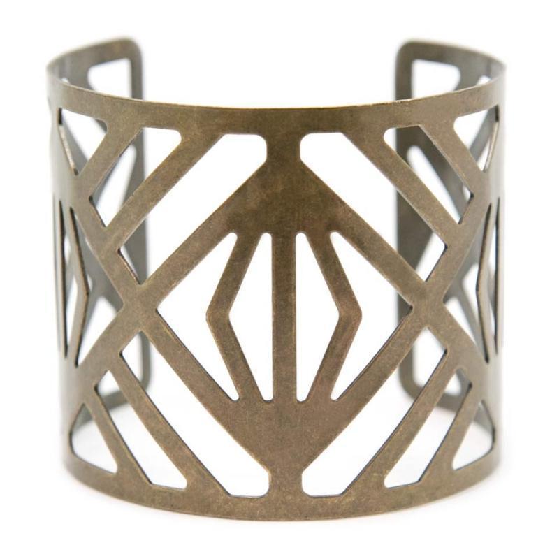 Tinted in an aged finish, a brass cuff is spliced into an indigenous tribal pattern. The airy stencil cutout allows the skin to become the natural canvas behind this brazen cuff.
