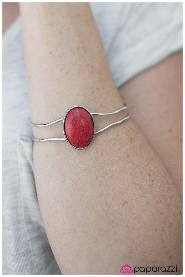 An earthy red stone adorns the center of an airy silver bracelet. The shimmering silver wire spins around the wrist, allowing the skin to become the natural canvas behind this Southwestern inspired design. Features an adjustable hinged clasp.