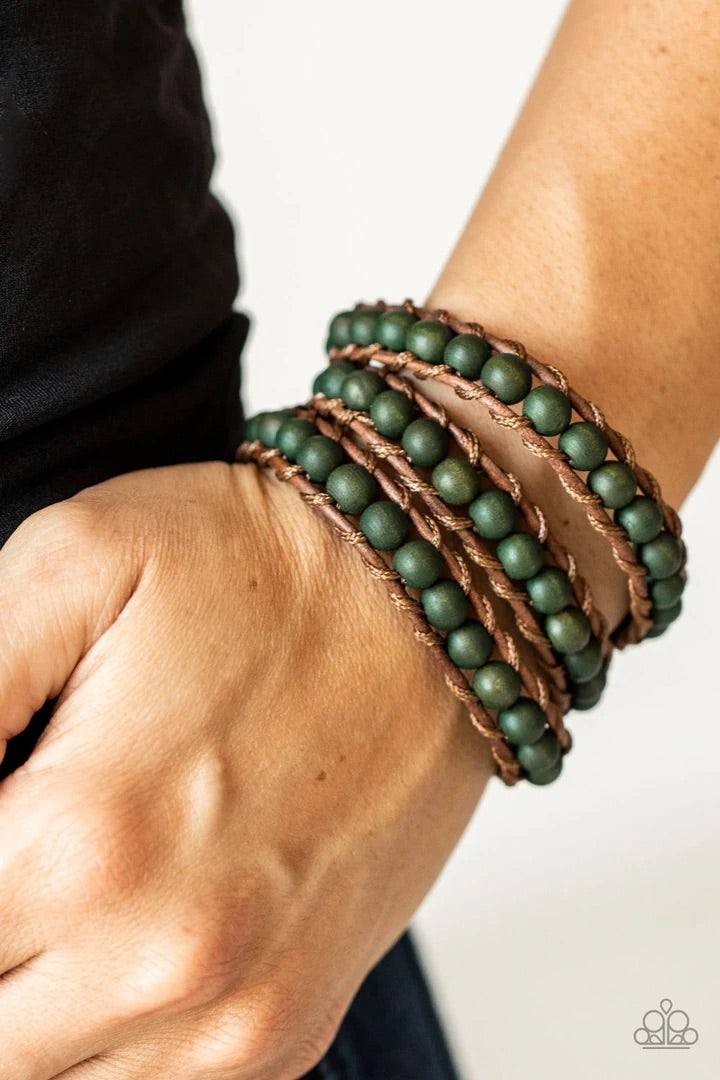 A row of green wooden beads are knotted in place along two brown leather cords, creating multiple earthy layers around the wrist with its extended length. Features an adjustable button loop closure.
