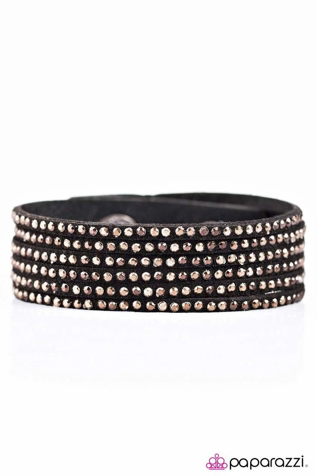 A strip of black suede is spliced into skinny glittery strands embellished in sparkly copper studs. Features an adjustable snap closure.