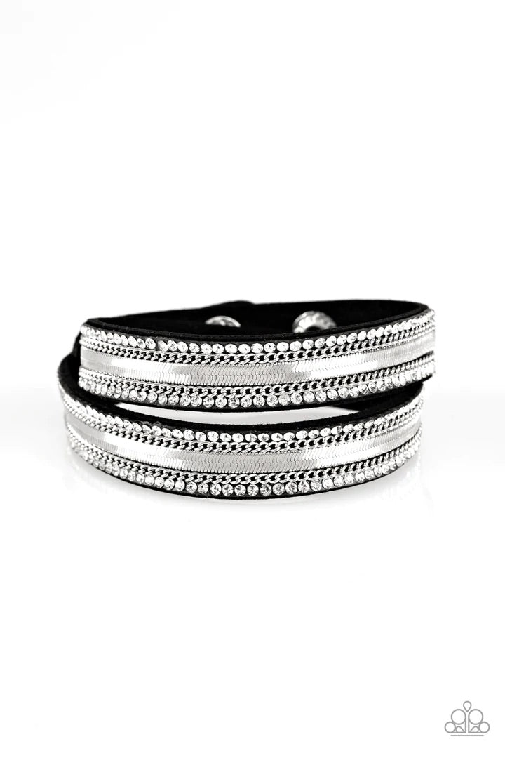 Rows of classic silver chain, flat silver chain, and dainty white rhinestones are encrusted along a black suede band for a sassy look. The elongated band allows for a trendy double wrap design. Features an adjustable snap closure.