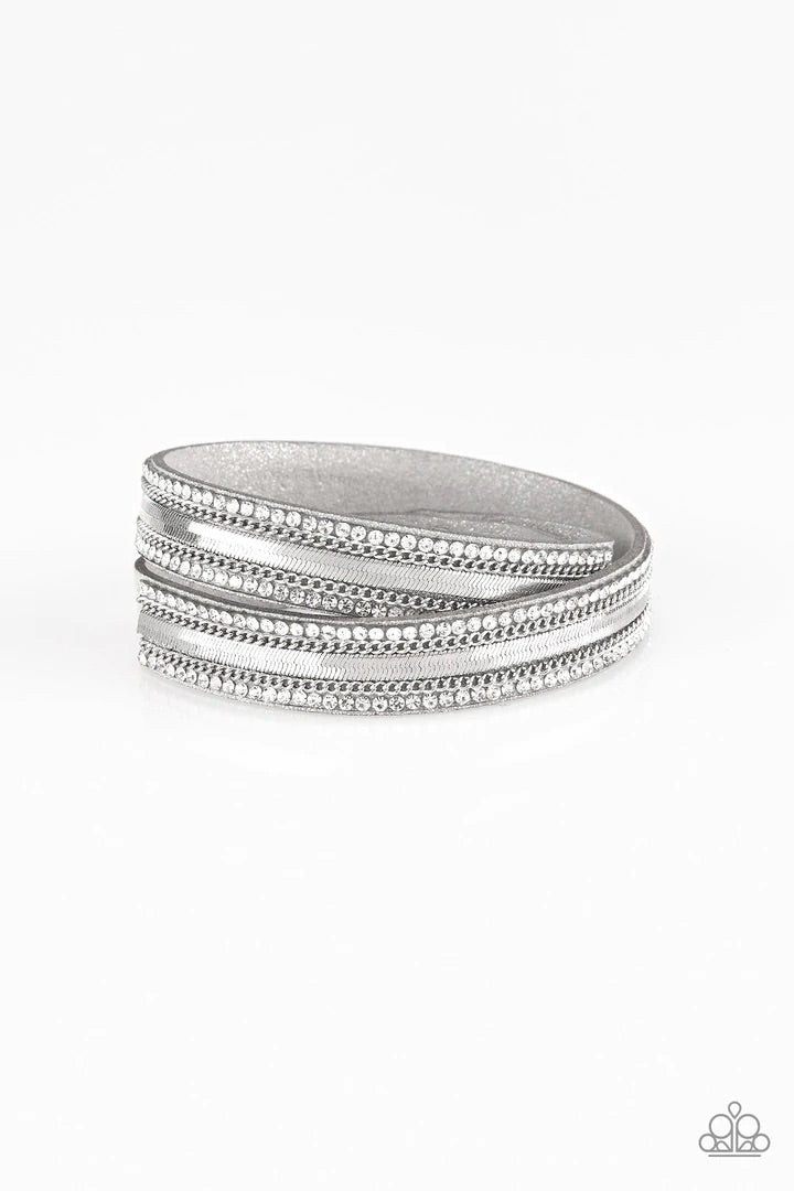 Rows of classic silver chain, flat silver chain, and dainty white rhinestones are encrusted along a gray suede band for a sassy look. The elongated band allows for a trendy double wrap design. Features an adjustable snap closure.