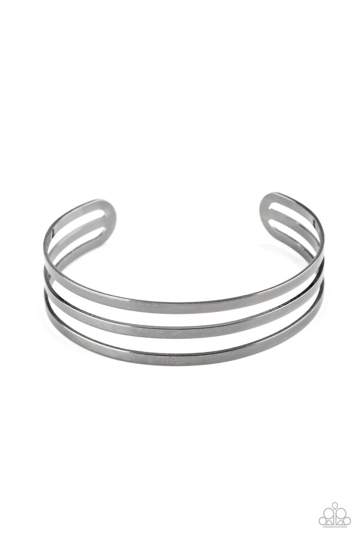 Flat gunmetal bars race across the wrist, coalescing into a sleek cuff for a casual look.