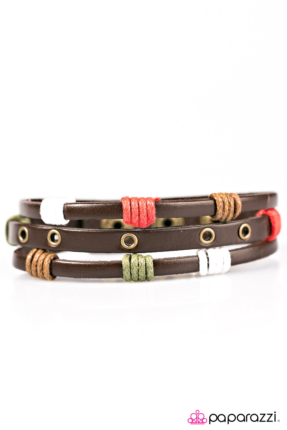 Sections of brown, green, red, and white twine knot around three leather bands, creating a colorfully layered palette around the wrist. Features an adjustable snap closure.