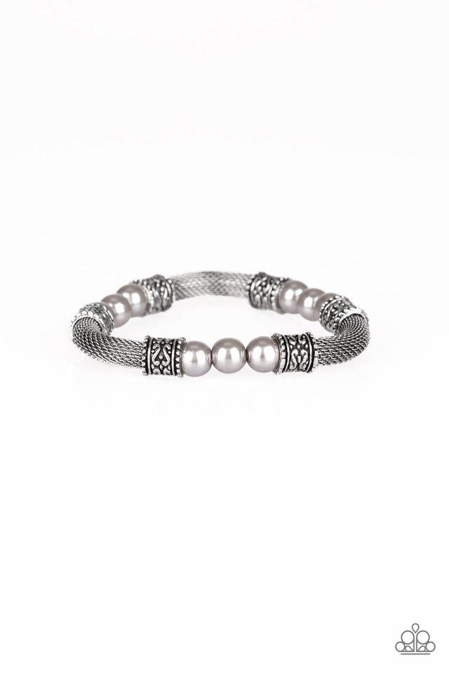 Pearly silver beads, ornate silver accents, and sections of silver mesh chain are threaded along a stretchy band around the wrist for a refined flair.