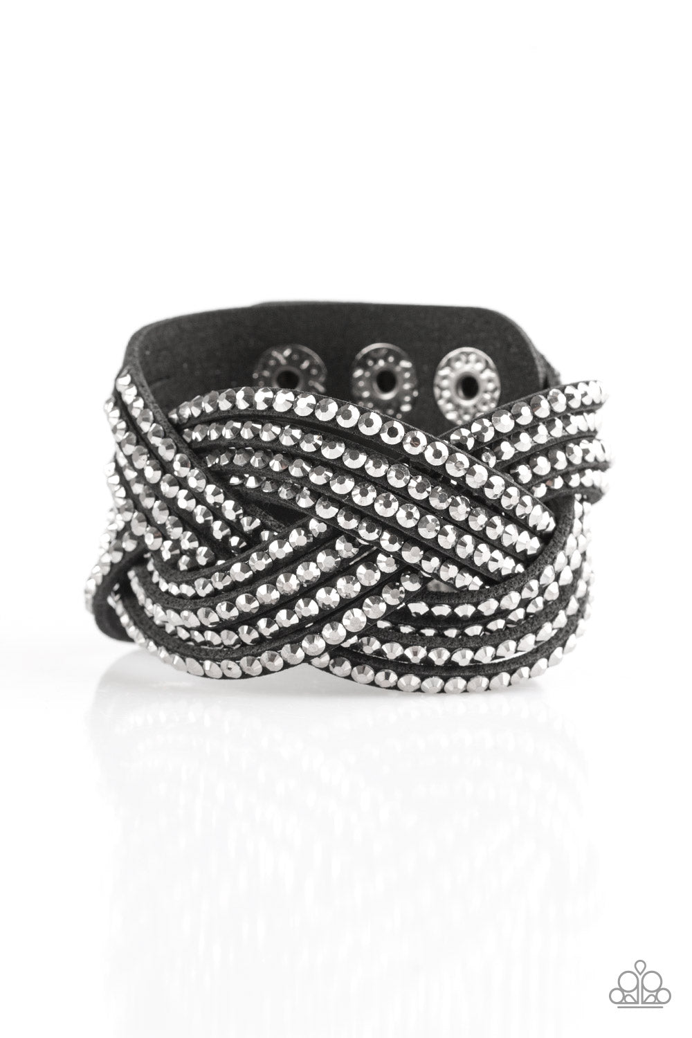 Oversized glassy hematite rhinestones are encrusted along strands of crisscrossing black suede, creating a fierce shimmer around the wrist. Features an adjustable snap closure.