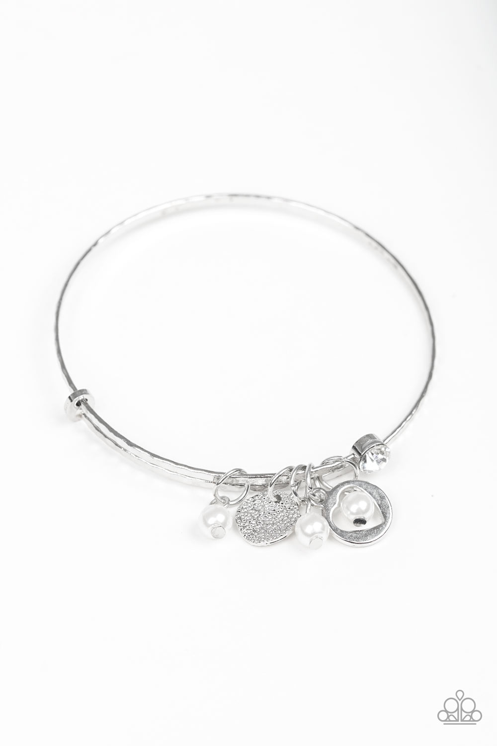 A delicately hammered silver wire coils around the wrist, creating an adjustable-like bangle. Infused with a silver and white rhinestone fittings, a collection of pearly white beads, a hammered silver disc, and a charming heart charm slides along the wrist in a whimsical fashion.