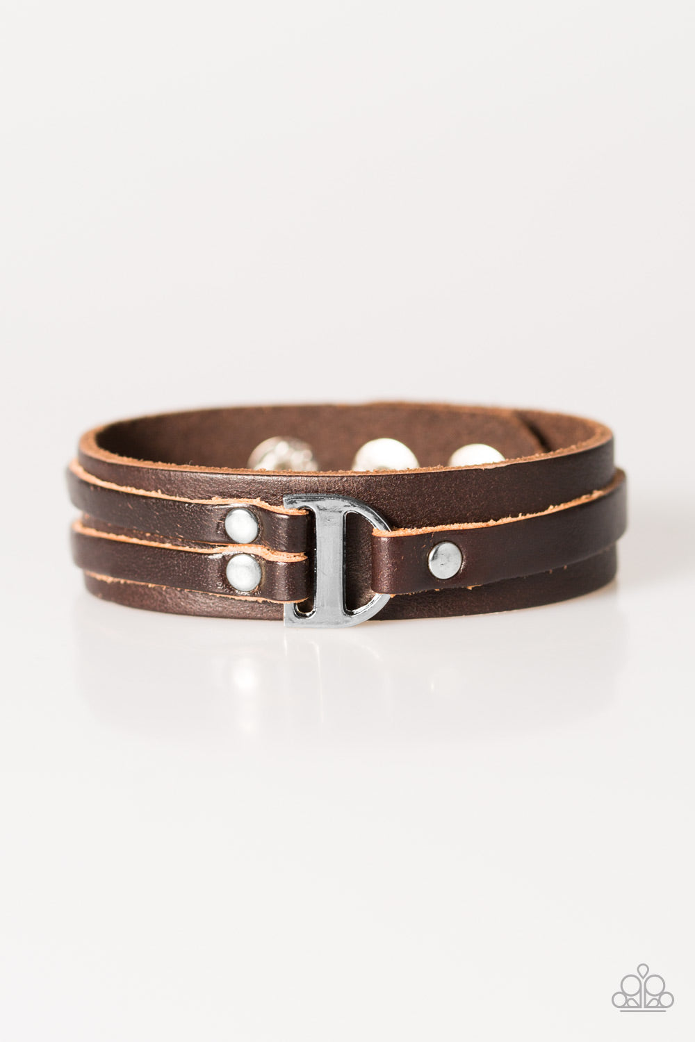 A shimmery silver centerpiece is studded in place across the front of a brown leather band for an urban look. Features an adjustable snap closure.
