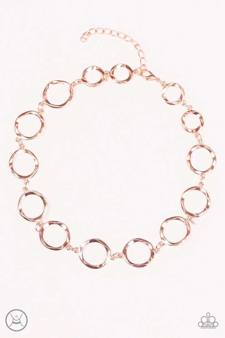 Delicately hammered in shimmery textures, asymmetrical copper hoops link around the neck in an artisan inspired fashion. Features an adjustable clasp closure.