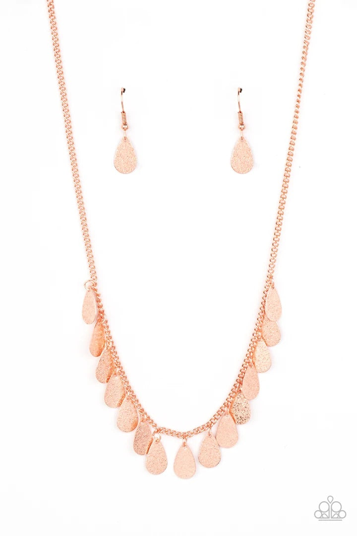 Delicately hammered in blinding shimmer, a dainty row of flat shiny copper teardrops drip from the bottom of a dainty shiny copper chain below the collar for a minimalist inspired fashion. Features an adjustable clasp closure.