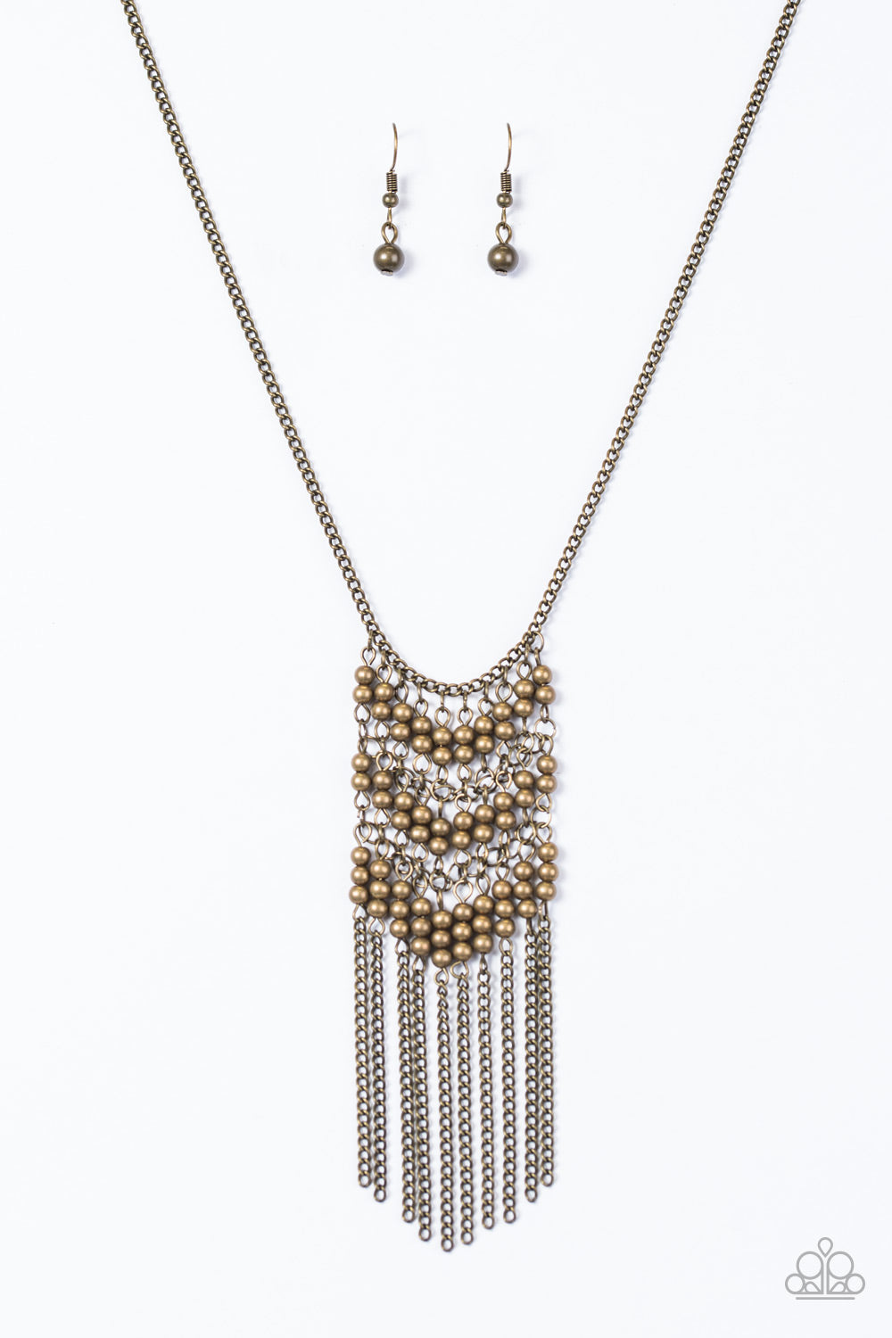Threaded along metallic rods, dainty brass beads link together, creating a dramatic mesh pendant. Brushed in an antiqued shimmer, brass chains stream from the bottom of the edgy pendant for a bold industrial finish. Features an adjustable clasp closure.