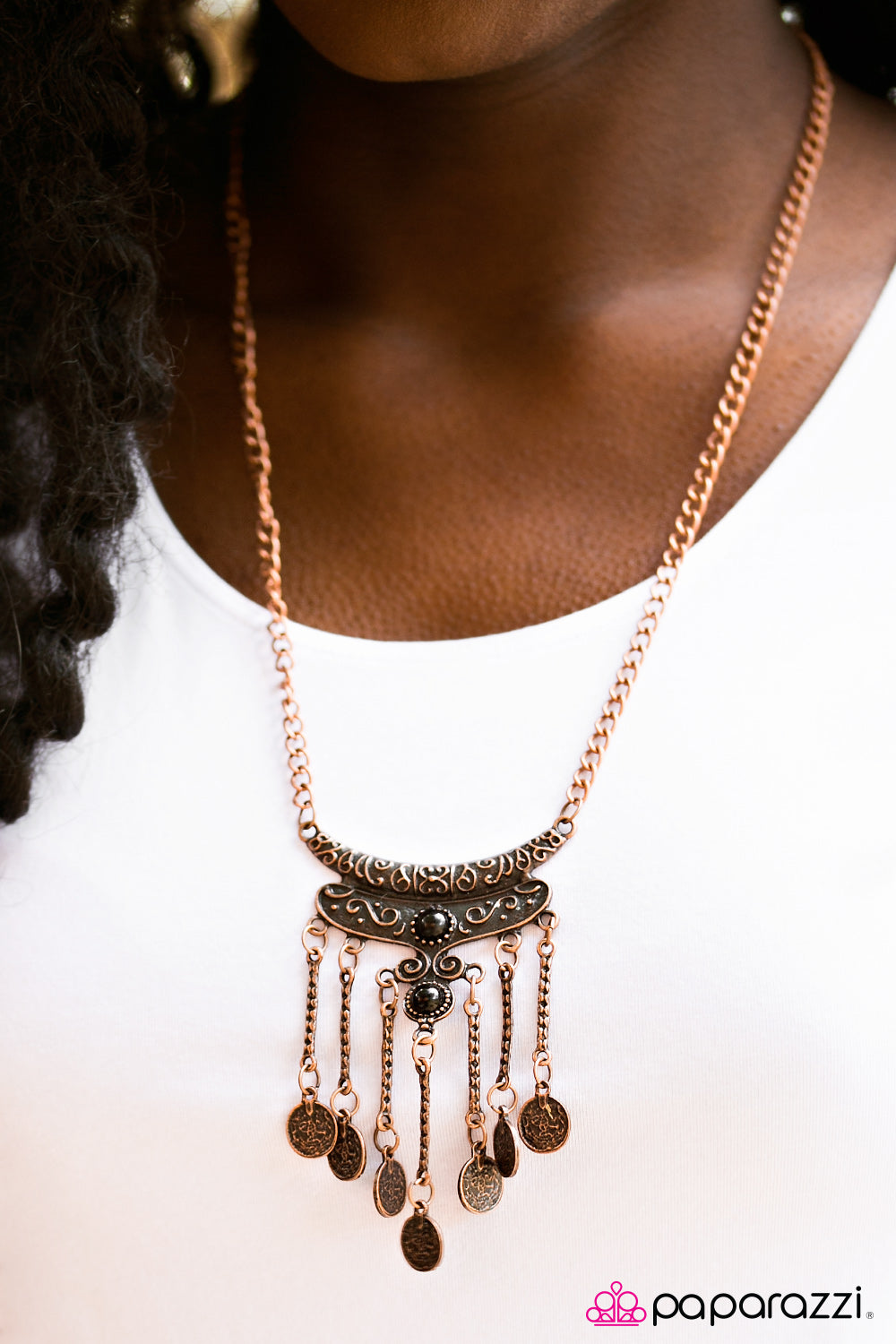 Embossed in indigenous textures, a dramatic copper pendant swings from the bottom of a bold copper chain. Stamped in coin-like patterns, dainty copper charms dangle from the bottom of the copper pendant, creating an adventurous fringe. Polished black beads are pressed into the frame for a refined finish. Features an adjustable clasp closure.