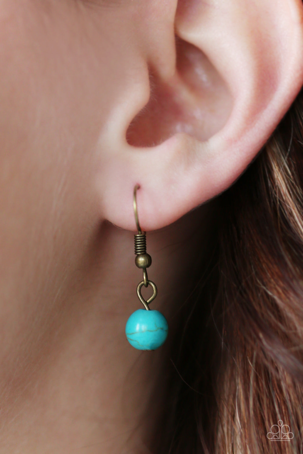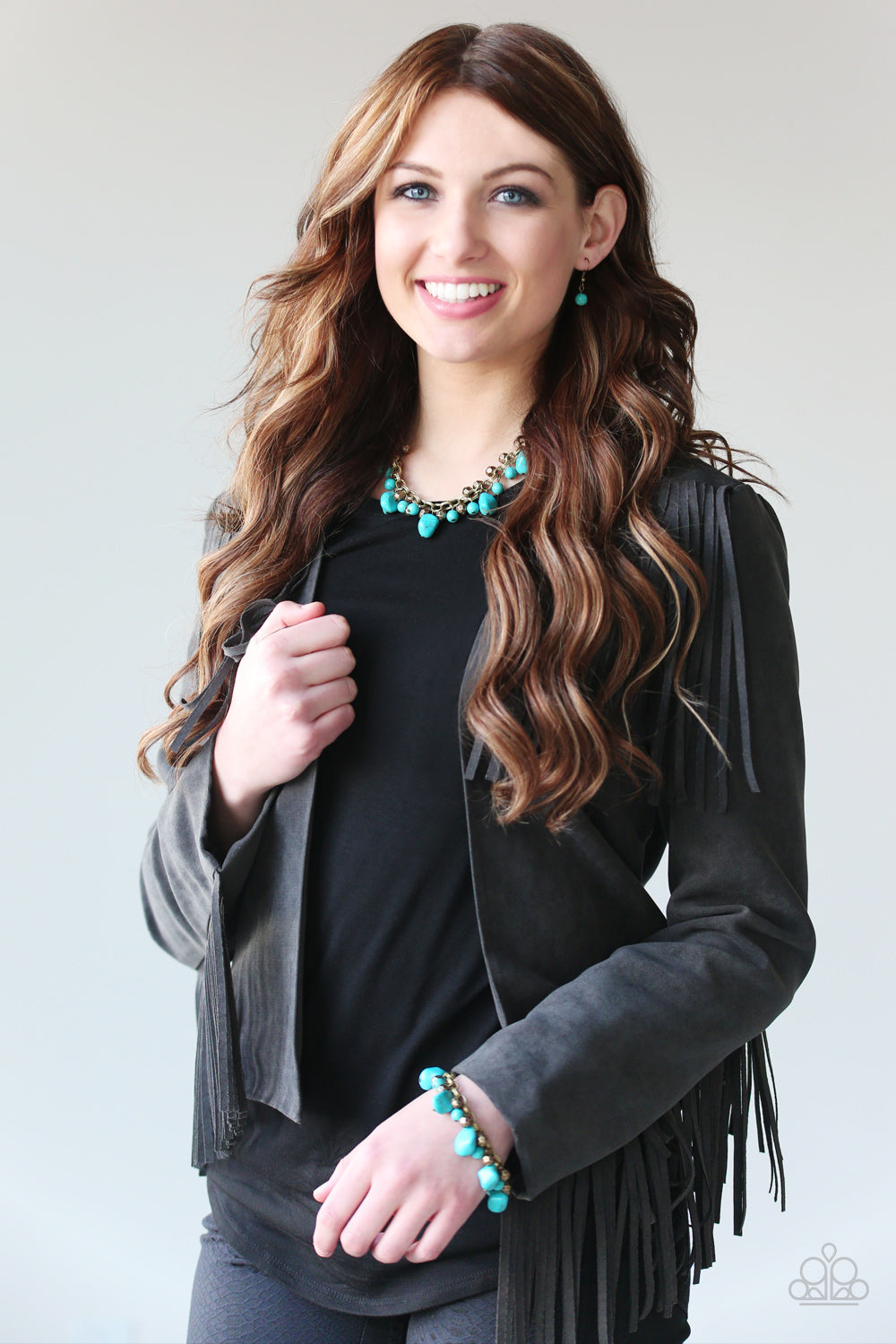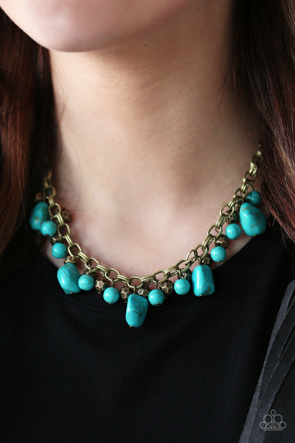 Featuring round and asymmetrical cuts, refreshing turquoise stones trickle from the bottom of a double chain-linked chain. Faceted brass beads trickle between the stones, adding a splash of metallic shimmer to the earthy fringe. Features an adjustable clasp closure.