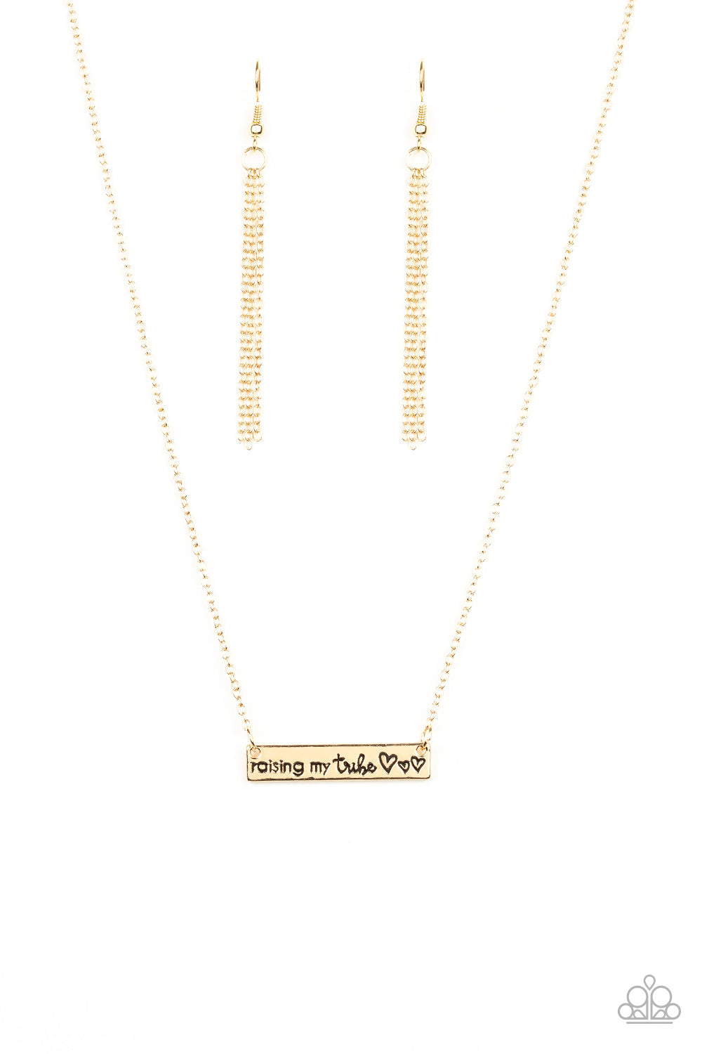 A shimmery gold frame stamped with the phrase, "raising my tribe", is suspended horizontally below the collar for a one-of-a-kind fashion. Features an adjustable clasp closure.