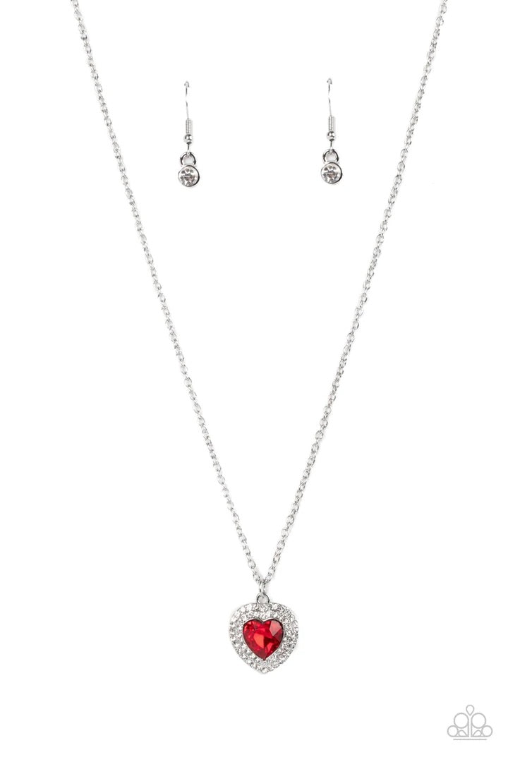 Bordered in stacked rows of glassy white rhinestones, a fiery red heart shaped gem sparkles at the center of a dainty silver chain for a flirtatious fashion. Features an adjustable clasp closure.