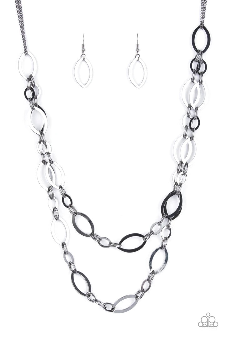 Stunning gunmetal ellipses link together for two layers of bold, basic drama. The layers hang from a simple gunmetal chain adding balance to the scene. Features an adjustable clasp closure.
