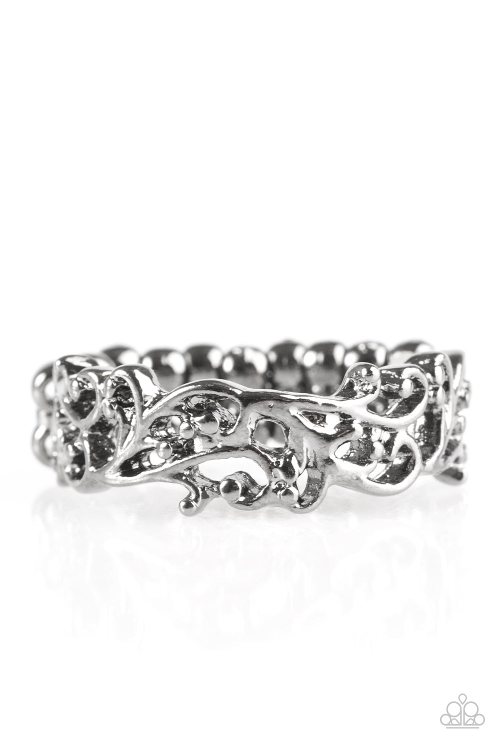 Brushed in a glistening gunmetal finish, shimmery vine-like filigree arcs across the finger, creating a seasonal band. Features a dainty stretchy band for a flexible fit.