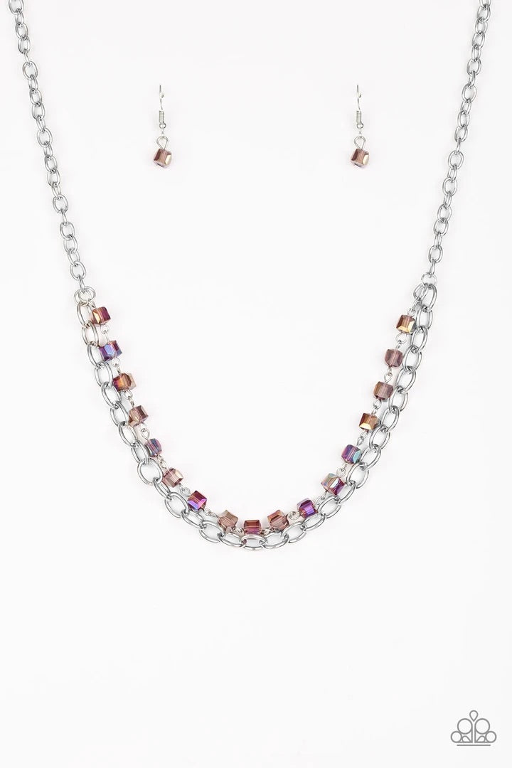 A strand of iridescent purple crystal-like cube beading joins a classic strand of silver chain below the collar, creating refined layers. Features an adjustable clasp closure.