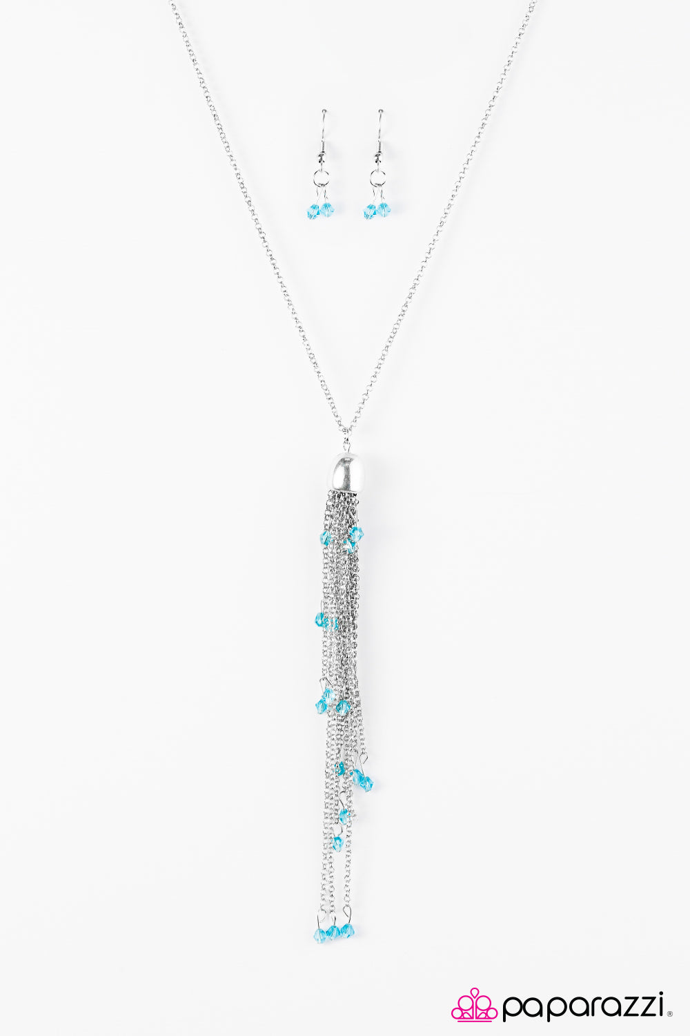 Blue crystal-like beads trickle from the bottoms of shimmery silver chains, creating a colorful tassel. Features an adjustable clasp closure.