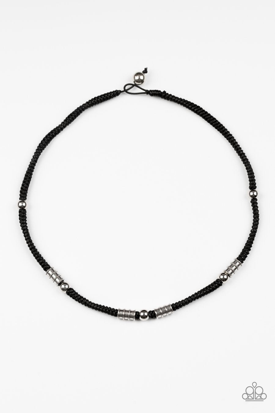 Braided black cording knots around shimmery silver accents below the collar for an edgy urban look. Features a button loop closure.