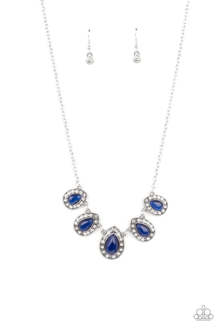 Bordered in glassy white rhinestones, glowing blue cat's eye stone frames delicately increase in size as they link below the collar, creating an enchanting display. Features an adjustable clasp closure.