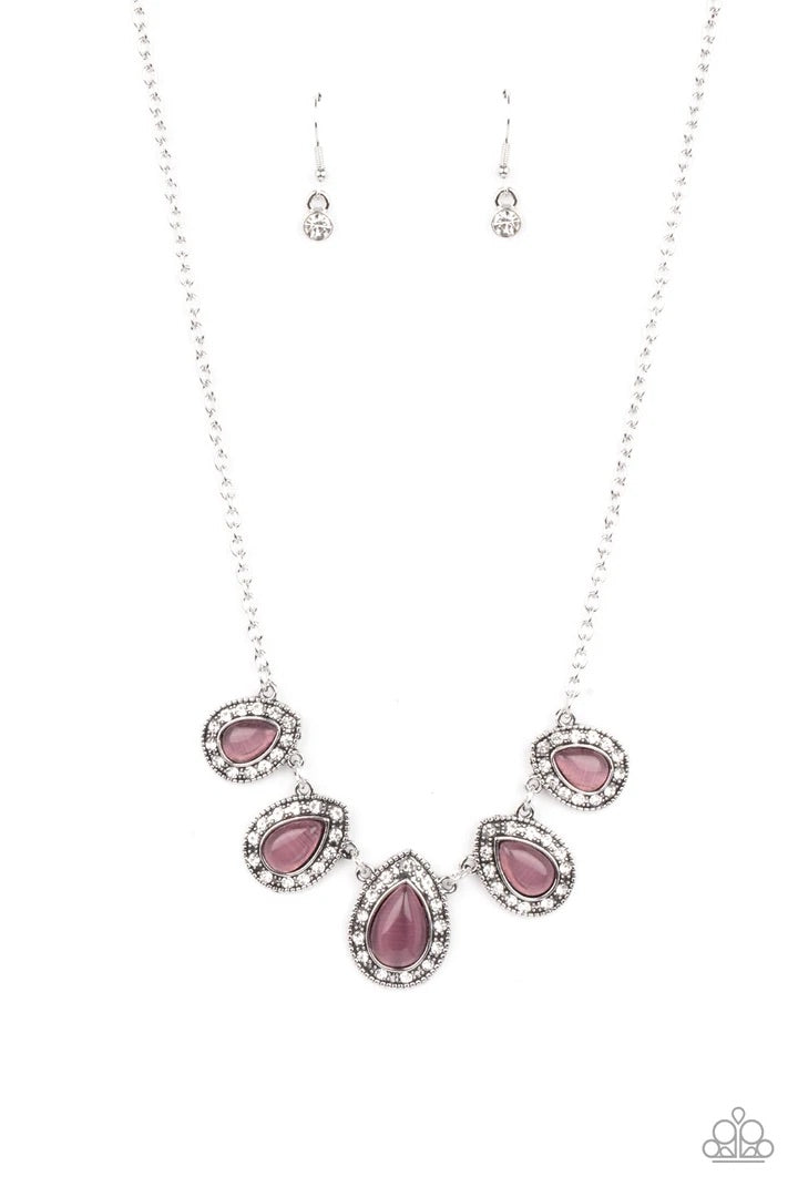 Bordered in glassy white rhinestones, glowing purple cat's eye stone frames delicately increase in size as they link below the collar, creating an enchanting display. Features an adjustable clasp closure.