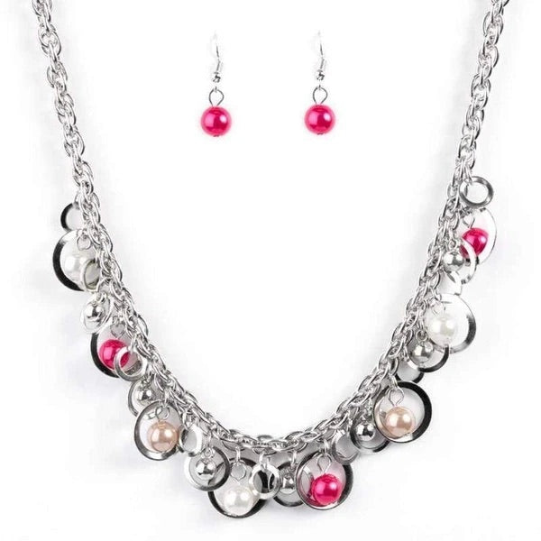 Brown, pink, and white pearls swing from a double-linked silver chain, creating a colorful fringe below the collar. Dainty silver beads and airy silver rings are sprinkled through the display, adding playful and whimsical accents. Features an adjustable clasp closure.