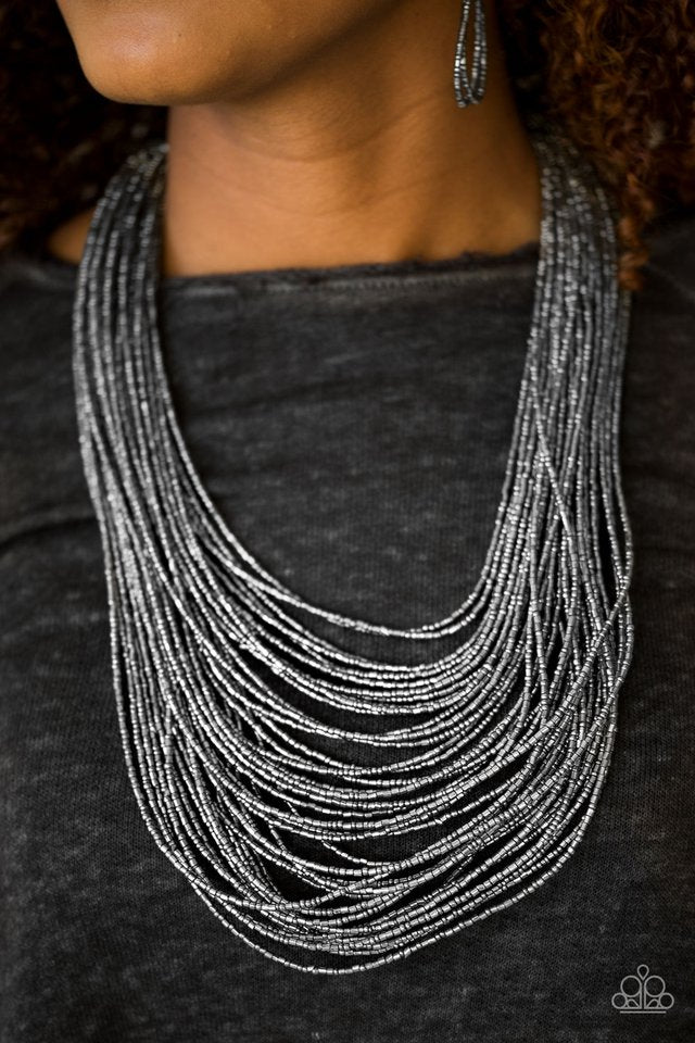 Brushed in an icy metallic shimmer, countless strands of gunmetal seed beads drape across the chest in a bold fashion. Featuring a collision of shapes and shimmer, the glittery strands connect to two large silver accents for a flashy finish. Features an adjustable clasp closure.