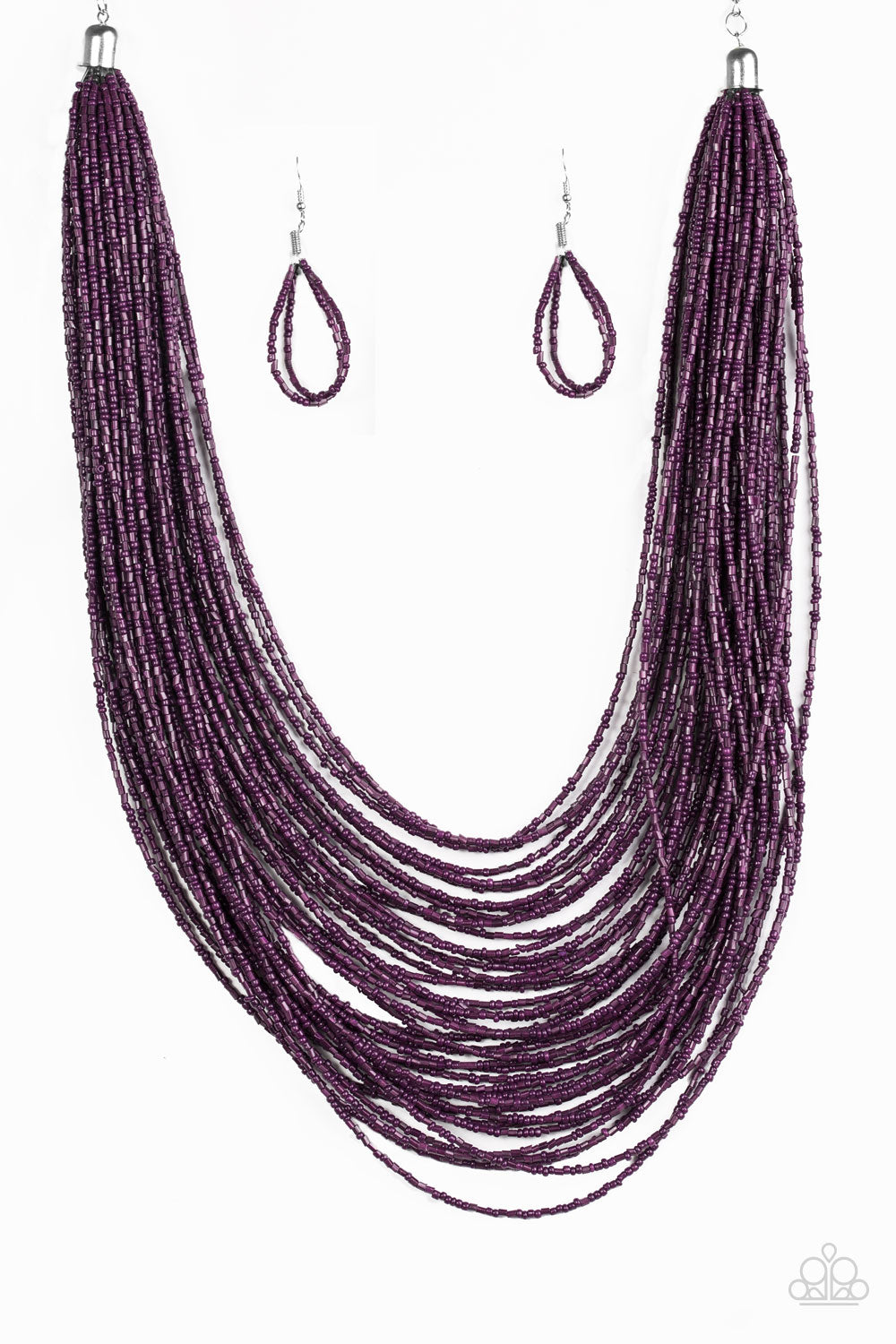 Countless strands of purple seed beads drape across the chest in a bold fashion. Featuring a collision of shapes and shimmer, the vivacious strands connect to two large silver accents for a flashy finish. Features an adjustable clasp closure.