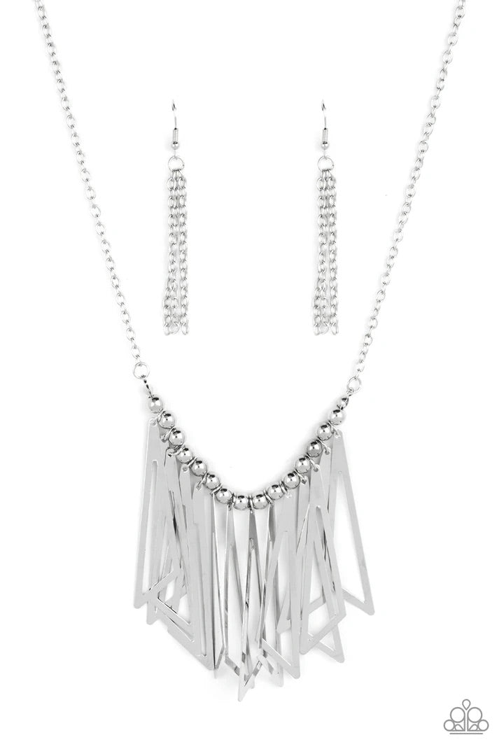 Flared silver triangular frames swing from a silver beaded chain below the collar, creating an intense industrial-inspired fringe at the bottom of a classic silver chain. Features an adjustable clasp closure.