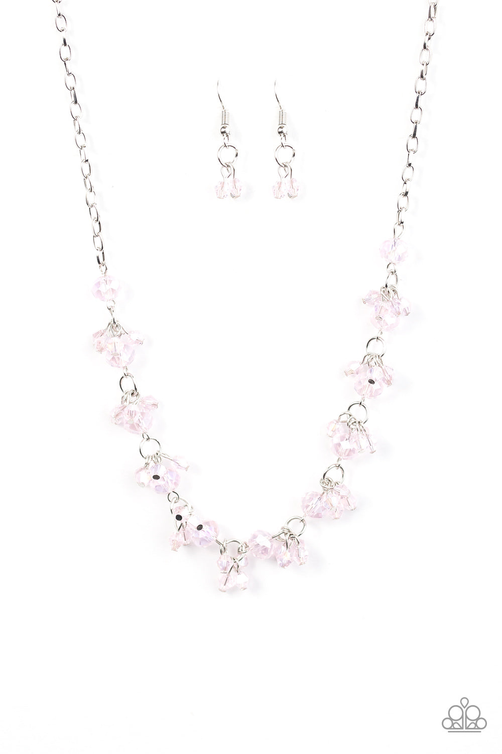 Glassy and faceted pink crystal beading trickles along a silver chain, creating a dramatic fringe below the collar. Featuring elegant pear-shaped cuts, iridescent crystals cluster atop the glassy gems for an incandescent finish. Features an adjustable clasp closure.