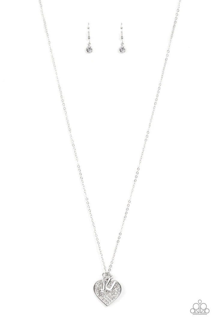 Encrusted with sparkly white rhinestones, an oversized silver heart charm dances between a pair of "I" and "U" charms, resulting in a heartwarming message along a dainty silver chain across the chest. Features an adjustable clasp closure.
