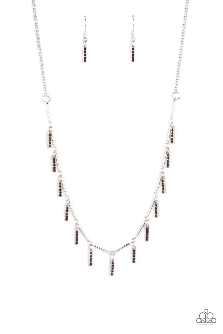 Dotted in stacks of glittery purple rhinestones, dainty silver rectangular frames drip between shiny silver bars along the collar, creating a dainty fringe. Features an adjustable clasp closure.