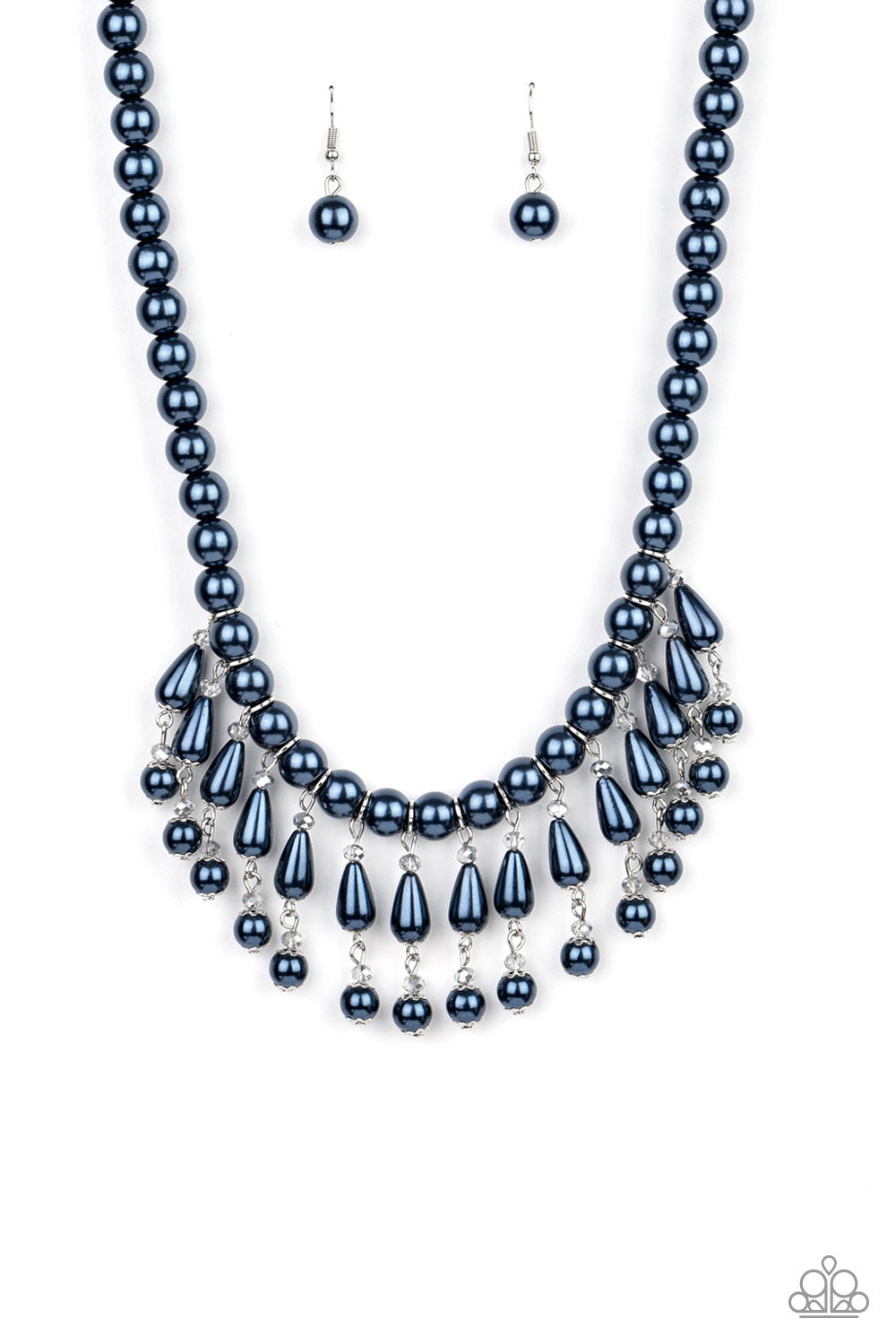 Pearly blue teardrop beads link with classic blue pearls as they drip from a timeless strand of blue pearls. Sprinkled with dainty crystal-like accents, the refined fringe cascades below the collar for a glamorous finish. Features an adjustable clasp closure.
