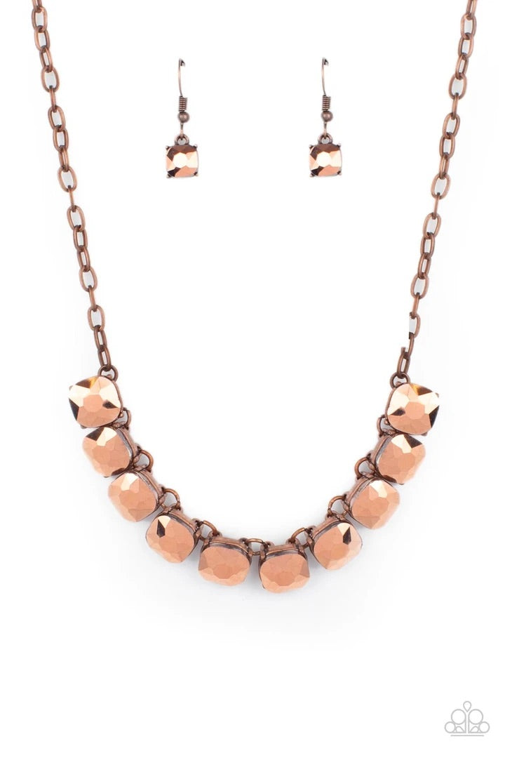 A succession of gleaming radiant-cut copper aurum gems attaches to a copper chain and falls below the collar for an edgy show-stopping display. Features an adjustable clasp closure.