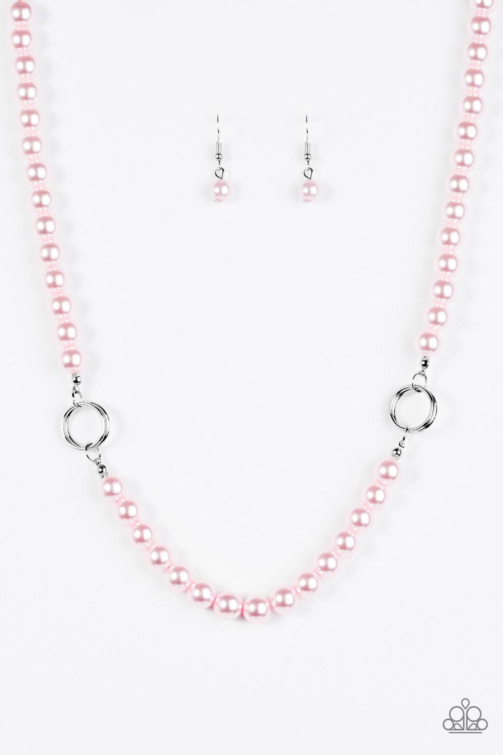 Shimmery silver hoops are threaded along a strand of classic pink pearls, creating timeless accents as the vintage inspired pearls dip below the collar in a refined fashion. Features an adjustable clasp closure.