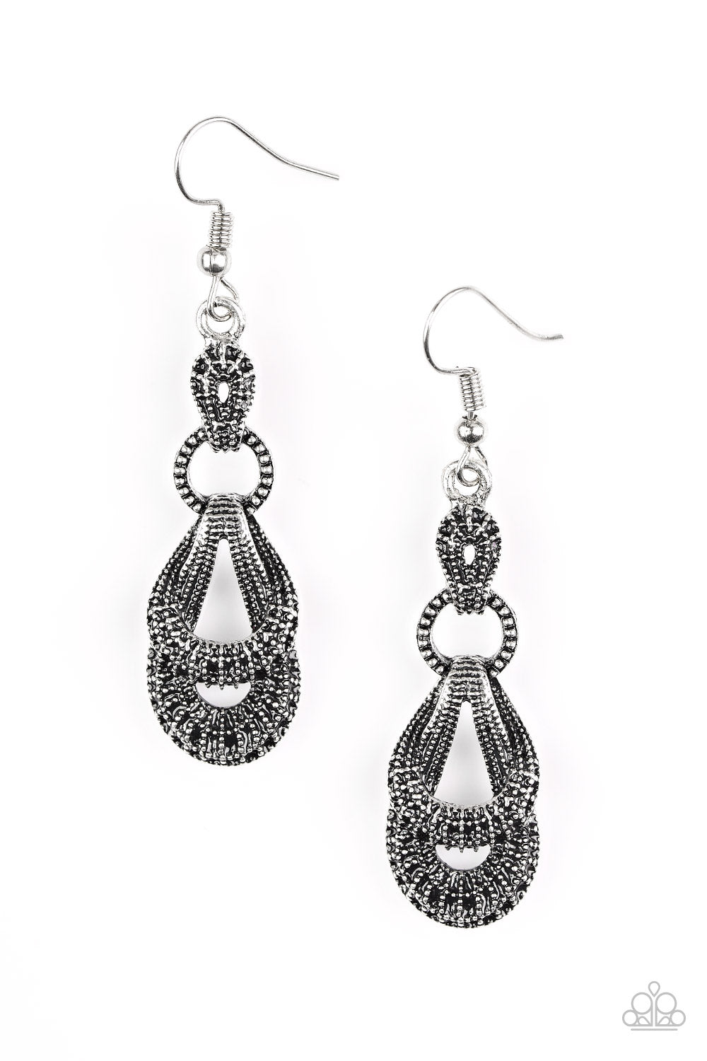 Hammered and studded in glistening details, abstract silver frames coalesce into a radiant lure. Earring attaches to a standard fishhook fitting.