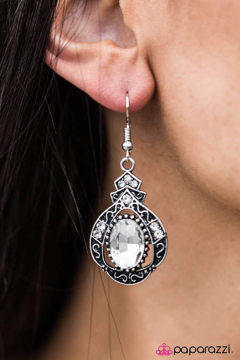 A luxurious white gem is nestled inside of regal silver frame. Dotted with dazzling white rhinestones and silver filigree, the enchanting frame swings from the ear in a rich and refined fashion. Earring attaches to a standard fishhook fitting.